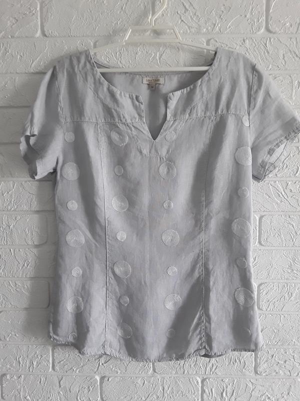 Легкая льняная блузка. Размер - М Состав - 100 % лен, вставки по бокам сзади - 100% котон. Цвет - серый , вышивка - серебристого цвета. Сзади по бокам вставки из трикотажа для удобства. Фото на теле нет. Возврата нет. Замеры: ПОГ - 50, ПОТ - 41, ПОБ - 49, длина - 62, рукав - 15см. + по бокам на спинке вставки из трикотажа, которые добавят ширины.
