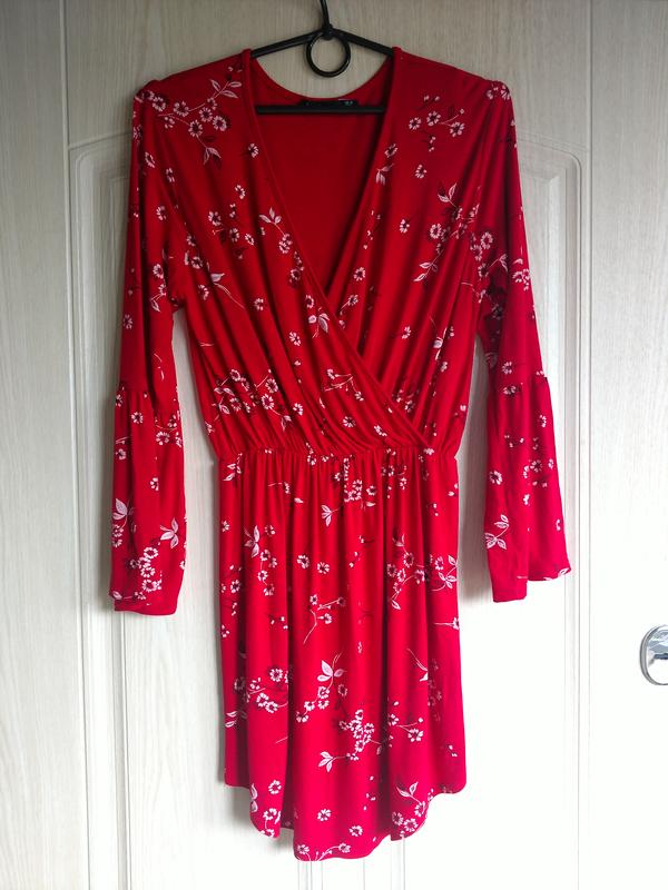 Блуза трикотажная с эффектом на запах. Цвет более спокойный красный с лёгким цветочным принтом длина 85