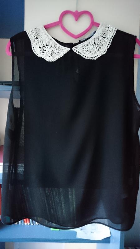 Новая, нежная, прозрачная ,черная блузочка " Atmosphere" без рукавов с оригинальным воротничком ,связаным крючком и декорированым бусинами и камушками. Длина - 64; плечо - 11,5; ширина под мышками - 53; по низу - 55.