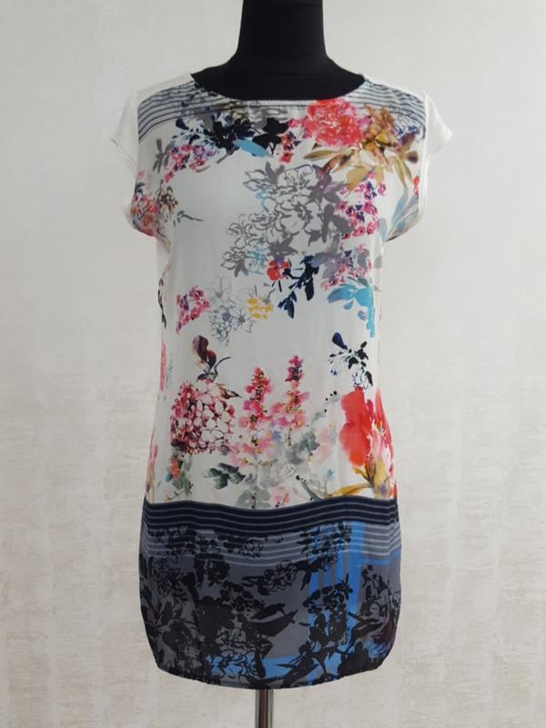 Лёгкая летняя блуза с эффектным принтом от бренда PROMOD — стильная модная одежда, а сам бренд хорошо известен и пользуется широкой популярностью во многих странах мира Спинка -тонкий трикотаж,перёд-шелковистая ткань.Бирки с составом отсутствуют. Размер М