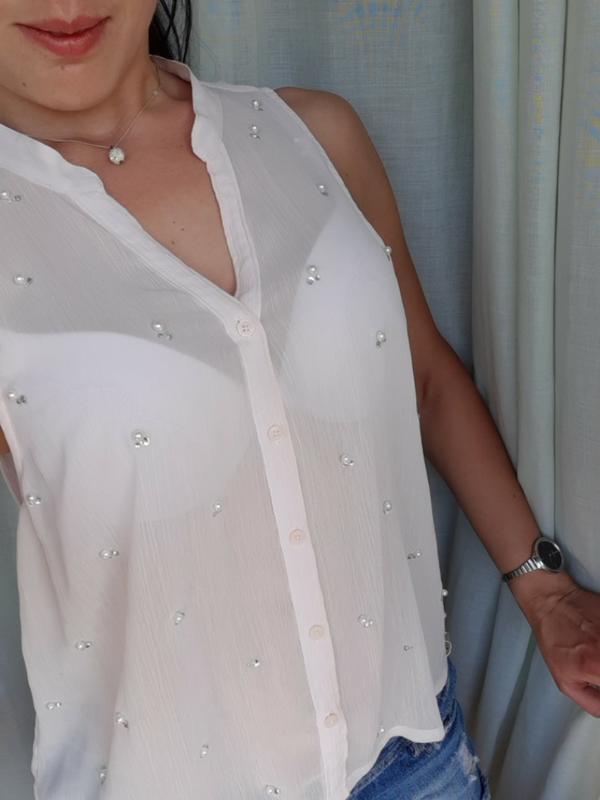 Легкая летняя блузка с камешками и бусинками слегка пудрового цвета