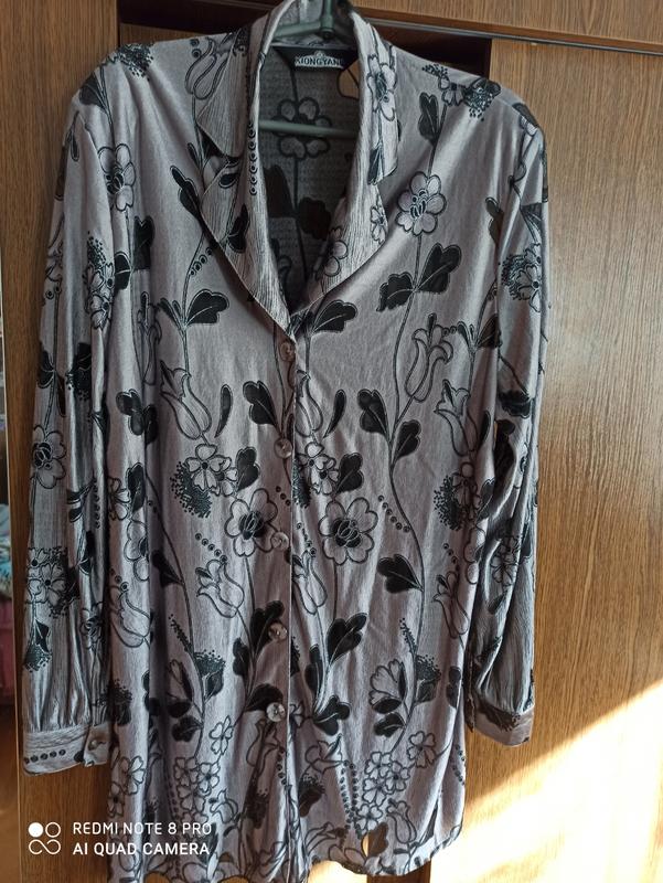 Срібляста блузка з оригінальної тканини. Листочки просвіщаються.Вільний покрій, довга, з боків розрізи.