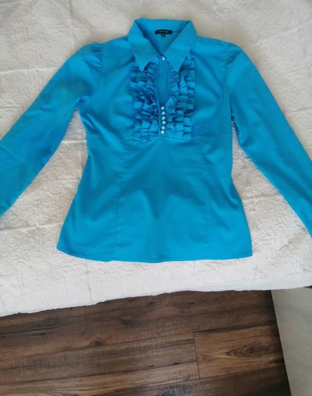 Блуза голубого цвета с акцентом в виде оборок на груди