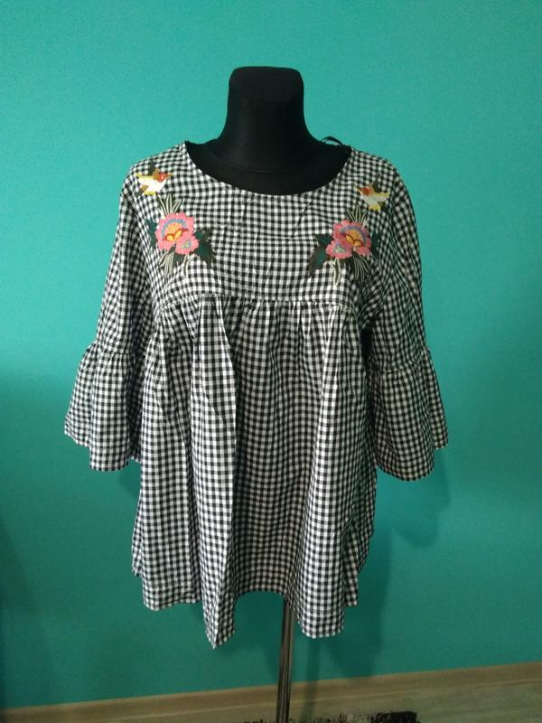 Блуза разлетайка в клетку с четвертным рукавом, украшена вышивкой на груди