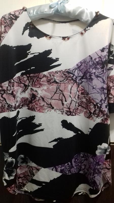 Блузочка трикотажная мягусенькая. дефектов нет все камушки на месте. Замеры ПО-грудь ,талия,бедра 59+.Длина 66,рукав 20.