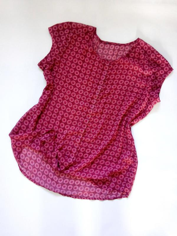 Яскрава блуза, легенька, на пепеді ряд ґудзиків (сховані), не просвічується, розмір 44-46
