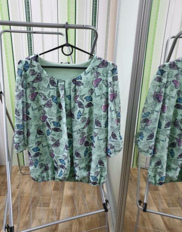 Легкая ткань+подкладка, рукав 3/4. Длина 62 см, на грудь 98-105 см. Есть небольшой ньюанс - последнее фото, сзади в одном месте немного выстрепалась ткань (в носке не заметно, или можно зашить)