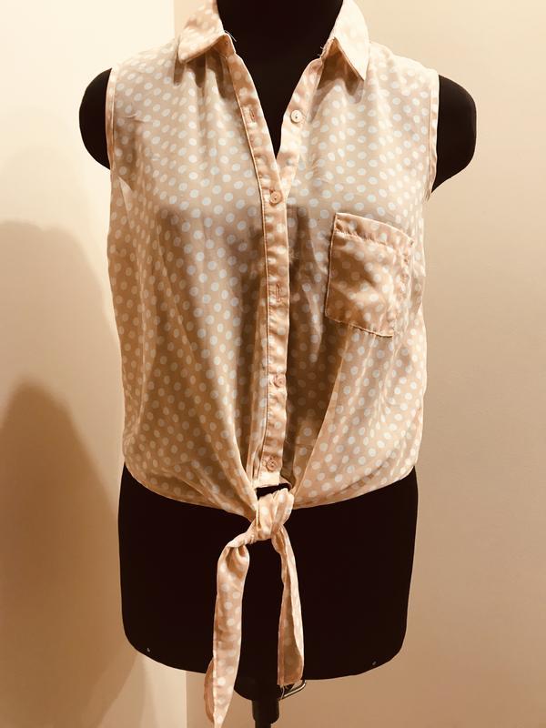 Персикова блуза/сорочка в горошок Стан ідеальний Розмір вказаний 10 Довжина виробу 50 см, ПОГ 52 см, ПОТ 50 см, ПОБІДИ 55 зав'язується