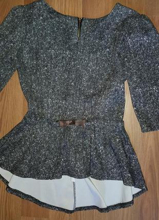 Очень интересная, сзади длинее.Идеально как с юбкой так и с брюками. Рукав 3 четверти