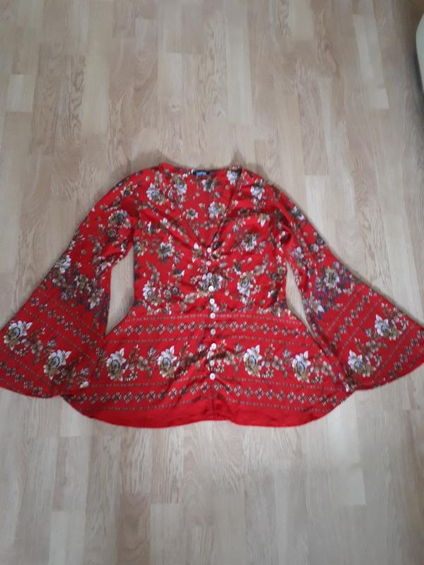 Стильная боуза, красный яркий цвет в цветочный принт. Очень приятная легкая ткань. Пуговицы рабочие, рукава колокольчики, приталенная к низу свободна. Размер М, дополнительные замеры сброшу, модно и на С.