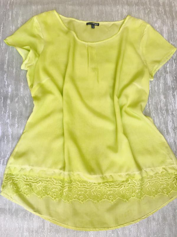 Вискозная салатовая блуза с кружевной отделкой . Реальный цвет на первом фото Длина по спинке 76 см, рукав от плеча 15 см, ПОГ 63 см, ПОТ 60 см, ПОБ 66 см Состав: Вискоза