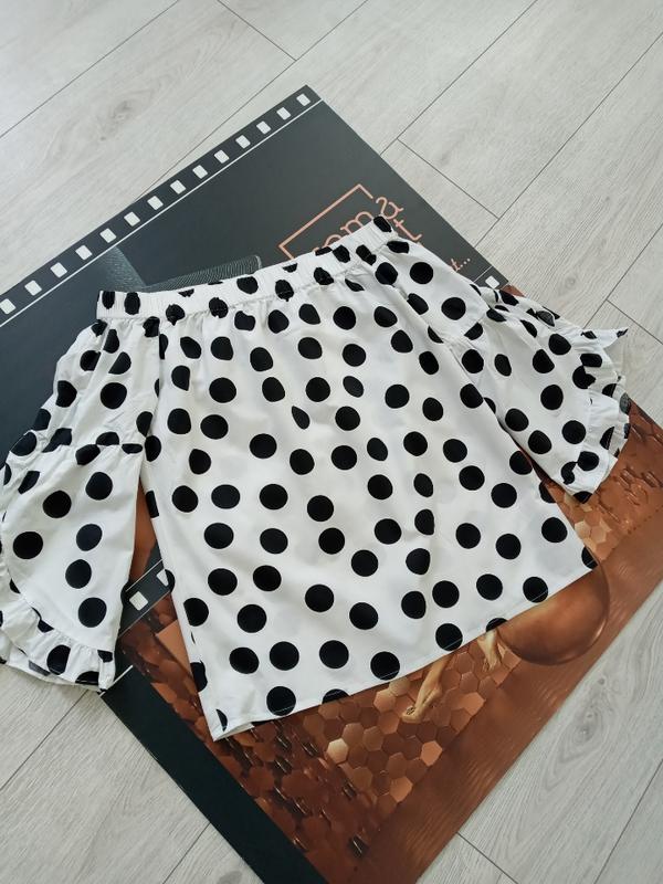 очень красивая блуза в горох,из натуральной ткани,по плечам на широкой резинке,пог 47,ди 58