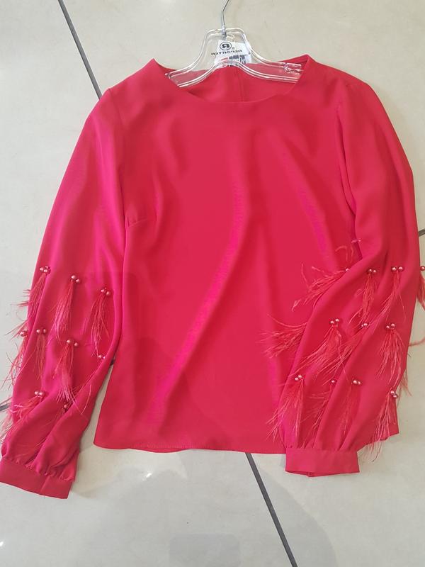 Блуза жіноча червона. Рукава з перлами і пір'ям.Дуже красива святкова блуза.