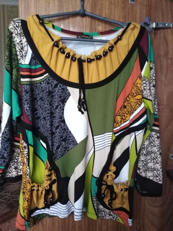 Кофта в хорошому стані 54 розміру. Довжина 62 см, ширина 57 (тканина тягнеться), рукав 3/4, 48 див.