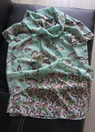 Легкая шифоновая блузка, без застежки, свободный крой. В два слоя, комбинация различных принтов. Длина по спинке 58, ширина на уровне проймы 94, по низу 102.