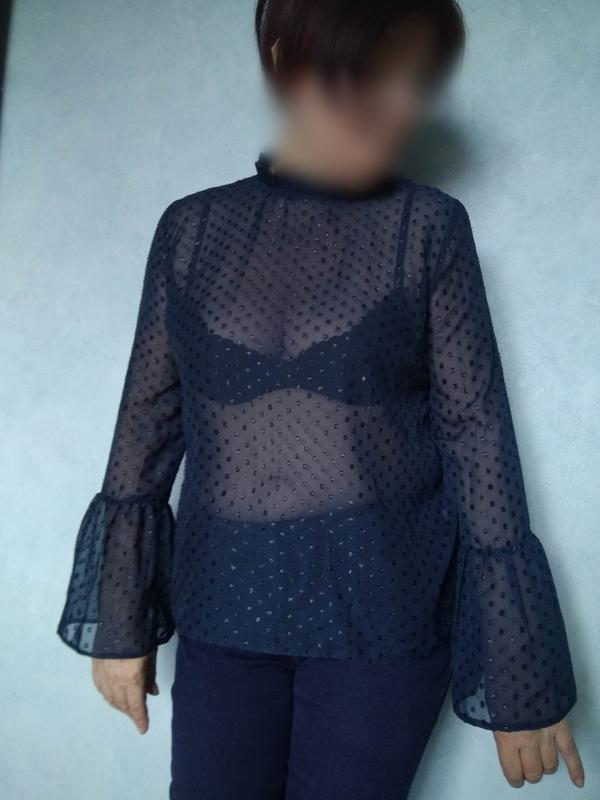 Прозрачная свободная нарядная тёмно-синяя блузка new look с блестящими переливающимися горошинами, воротником-воланом и расклешенными пышными рукавами. Блуза стильная и эффектная. Тёмно-синий - цвет королев, всегда приличный и элегантный. Длина 62 см Длина рукава 61 см ПОГ 55 см ПОТ 56 см Низ 58 см Плечи по спинке 40 см Блуза не ношеная, но без бирки