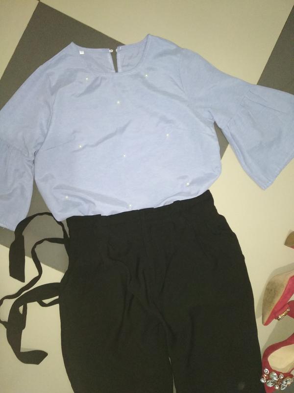 невероятная нарядная блузочка, ткань напоминает хлопок, или тоненький джинс, красивые бусы, рукав рюшик, прямого кроя