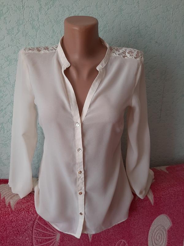 Блузка молочного цвета, верх спиники гипюровый, сама блузка шифоновая, пуговки перламутровые, из ракушки. Размер наш 42-44, xs по бирке. Сзади сбоку есть зацеп, можно обрезать, пока не трогала.