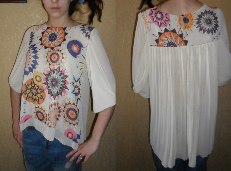 Красивая блуза. Хотя на блузке написано s реальный размер 44-46. Цвет светло бежевый.