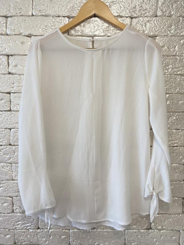 Блуза молочного цвета, по горловине сзади на пуговице. Рукава на завязках. Приятная к телу. Размер xs-s
