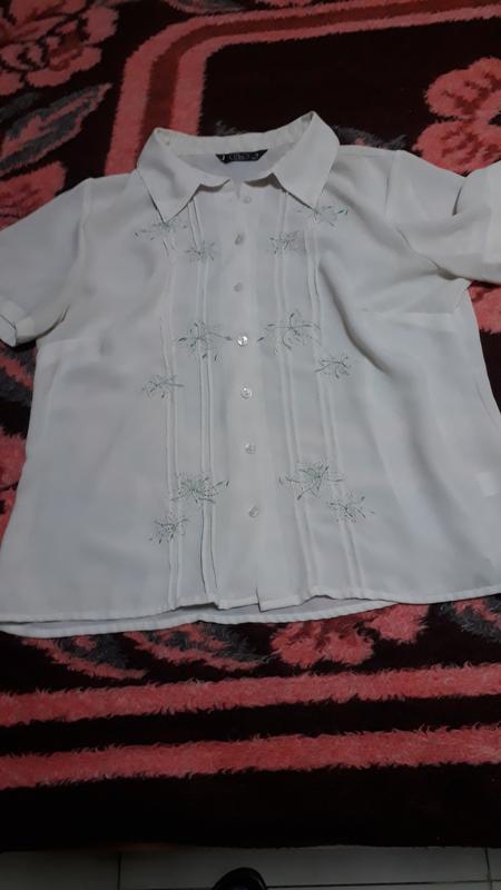 Колір--білий,з візерунком,кребс,дуже приємна на дотик,не парить в душну погоду довжина 60см;в плечах 40см; ПОГ 55см; ПОТ 52см; низ 58см