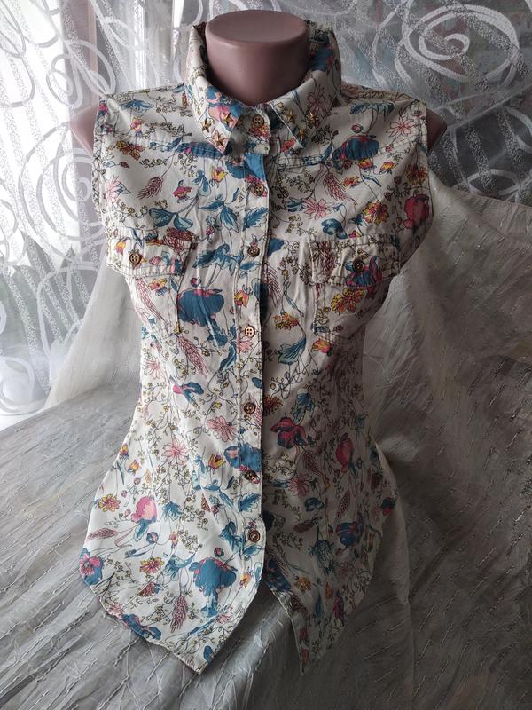 Стильна блузка з квітковим принтом на гудзиках, без рукавів. На грудях є два накладних кишені. На комірці заклепки у формі зірочки. Виробництво Туреччина. Розмір 40 Плечі - 36 см ПОГ - 45 см ПОТ - 41 см ПОБІДИ - 50 см