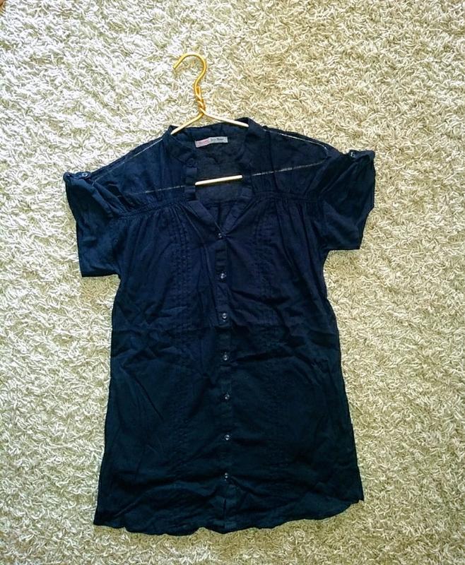 Блуза прямого силуэта. Изделие с фигурной горловиной и коротким рукавом на манжете. Спереди - врезные карманы с боковым доступом. Размер на бирке S Длина - 75 см. ПОГ - 45 см. ПОТ - 42 см.