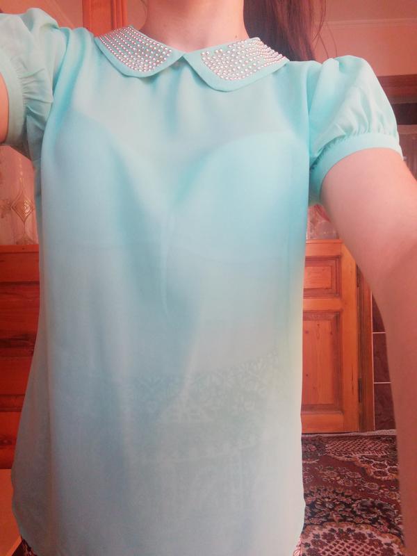 Напівпрозора блуза, бірюзового кольору,з красивим воротніком.