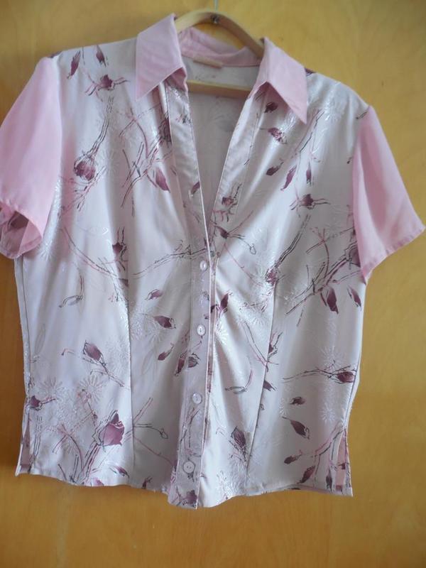 Блузочка, комбінована. Комір і рукави - шифонові. ОГ 106-108, ВІД - 92-94, довжина-63, довжина рукава - 19, розтяжність + 2 див.