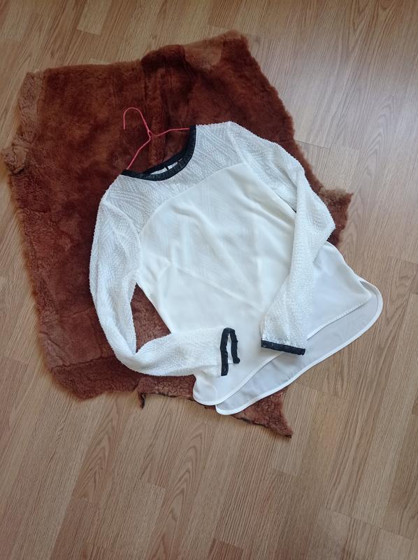 Шикарна біла блузка з вставками під шкіру на манжетах і горличку,з красивою спинкою