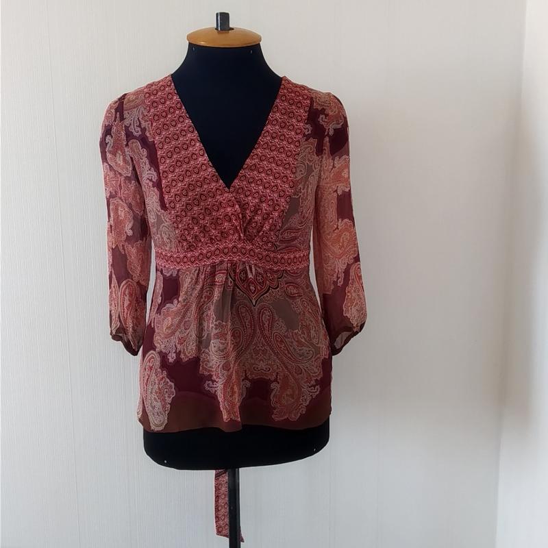 Блузка из натурального шелка. Лёгкая, воздушная. На спинке по талии резинка. По бокам вшит поясок, который завязывается сзади. Детали грудки на трикотажной подкладке. Рукав 3/4, снизу на резинке. Обхват под грудью 80см (ткань немного тянется). Ширина по спинке 31 см Длина по спинке 54 см Длина рукава 39 см