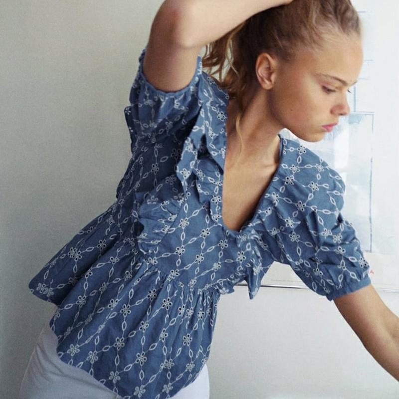 Топ з V-подібним вирізом і короткими рукавами-ліхтариками. З рюшами і вишивкою рішельє. Невидима блискавка збоку. З оф.сайту груди 46-47 см талія вільно 82 см довжина 57 см приблизні заміри,