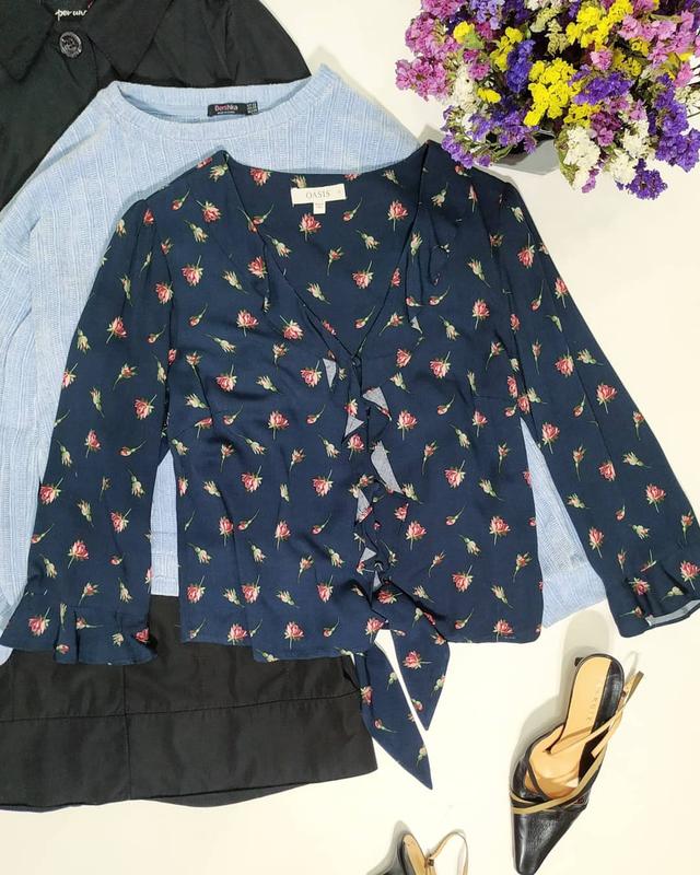 ❤️шикарная блуза в цветочный принт на пуговицах и внизу на завязках, рукав укорочен с воланом ☑️ Размер- 12, можно 10 Пог 48, длина 52, рукав 50, плечи 39 ☑️ Бренд- oasis ☑️ Состояние- идеальное Фото на теле не делаю!!!