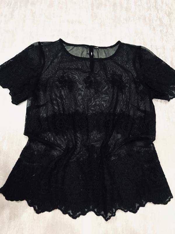 Чёрная кружевная блуза Италия . Красивое кружево. Бирки нет Размер подойдёт 40/44 Состояние новой Длина изделия 65 см, рукав от плеча 22 см, ПОГ 53 см, ПОТ 54 см, ПОБ 57 см.