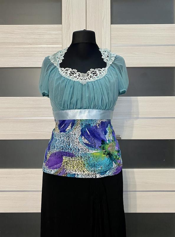 Шикарная неповторимая блузка известного французского бренда Adam pour Eve. Размер 4 , на украинский 48-50. Украшена набивным гипюром и атласной лентой. На груди и рукавах драпипорвка из сетки. Красивый яркий принт. Замеры: ПОГ 50 ПОТ 40 Полуобхват на уровне длины 47 Длина изделия 60 Длина рукава с плечом 25 Без торга. Распродажа.