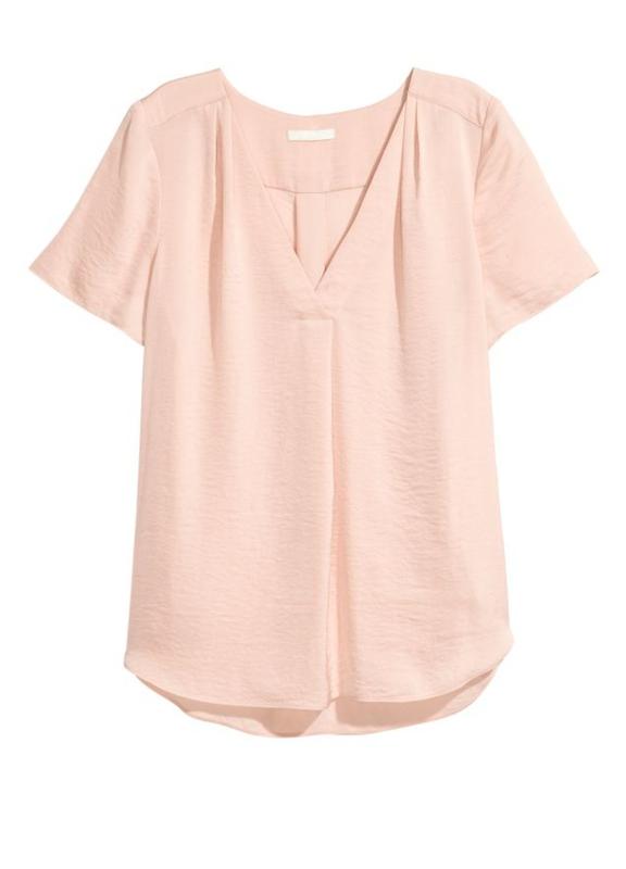 Блузка H&M с коротким рукавом из креповой ткани в цвете розовая пудра. Треугольный вырез со сборкой спереди и встречными складками сзади. Скругленный нижний край, спинка удлиннена. Состояние отличное Состав: полиэстер 100% ПОГ - 53,5см рукав - 21см Длинна по спинке - 71