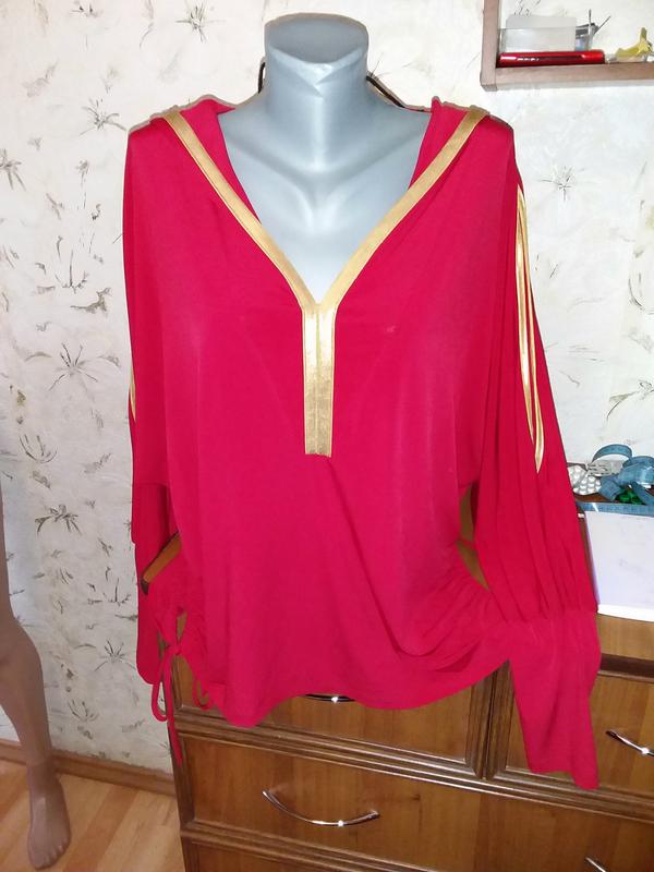 Блузка, трикотаж масло, яскравого червоного кольору. етикетка розміром зрізана, орієнтуйтеся на заміри, одягалася на 54 -56. стан в цілому відмінний, є незначний дефект - див. останнє фото. довжина від плеча до низу 64. довжина рукава від горловини 73. напівобхват грудей 72 тягнеться до 82. напівобхват внизу 56 тягнеться до 66. 17.