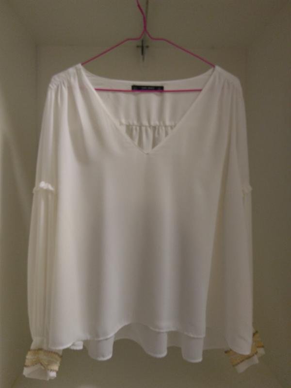 Стильная актуальная блуза свободного кроя с v-образным вырезом. Без застёжки. Рукава с небольшими аккуратными рюшами. Манжеты рукавов украшены нашивкой с бисером, бусинками и стеклярусом. Бирка срезана. Состав: полиэстер. Параметры: пог - 62 см, поб - 74 см, длина по спинке - 59 см, длина рукава - 62 см, глубина выреза - 20 см.