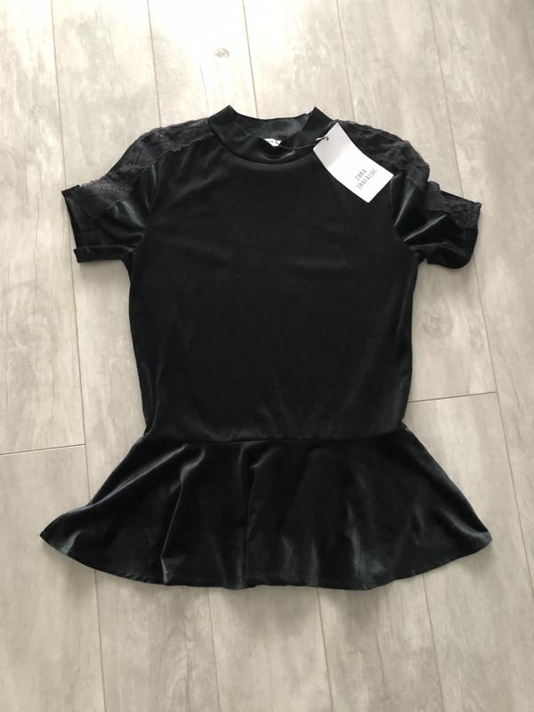 Блуза-футболка zara. Ткань под бархат. На рукавах строчки кружева. Размер S/36. Отлично подойднт и под джинсы и под брюки, юбки. За дополнительной информацией пишите-рада ответить.
