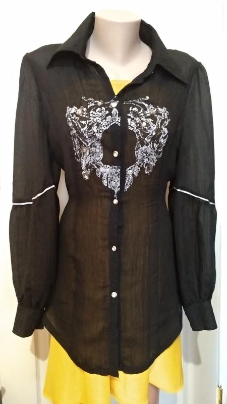 черная удлиненная,приталенная блузка,низ слегка закруглен.длина изделия-78см.длина рукава-60см.+6.5см. ПОГ-50см. ПОТ-45см. ПОБ-52см.торг.уместен.