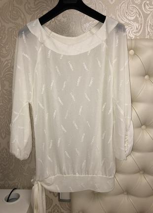Шикарна жіноча блуза з тканини La Perla, шили на замовлення. Дуже гарний крій рукава, внизу зав'язується. Шикарна тканина, повністю декорована вишивкою у вигляді фірмових лого. Тканина дуже дорога. Шився на розмір M {46}, можна пробувати і на L. Колір молочний. Заміри за запитом.