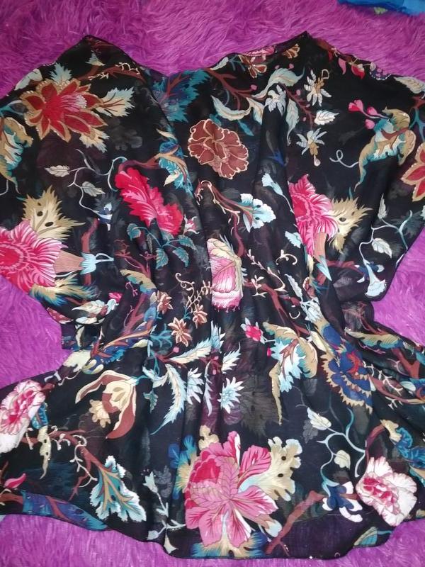 Шикарна легка шифонова блузка . Очень красивая, яркая,фасон-летучая мышь.В талии-резинка, отлично скрывает животик.Цекавый крой, качественная ткань.Ухаживает дорого и элегантно.S-L.