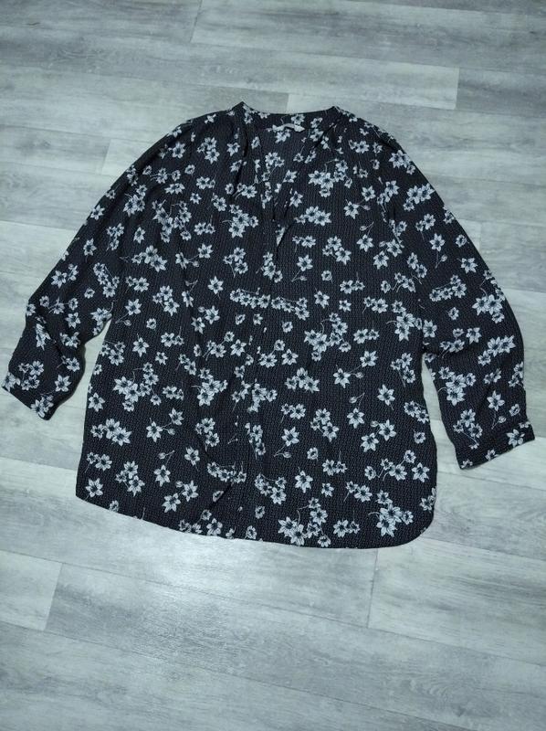 Блуза/рубашка женская черная с белыми цветами. Замеры: длина по спине 76 см, пог 53 см, рукав 61 см, плечи 39 см.