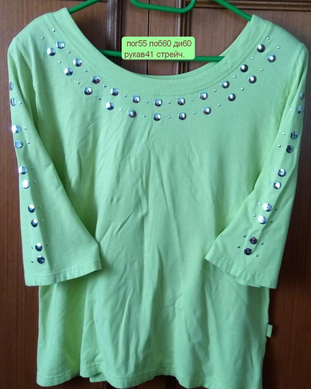 Очень приятный к телу нежно салатового цвета украшенный заклёпками.Рукав -41см, ПОГ-55см, ДИ-60см, ширина по низу-60см,