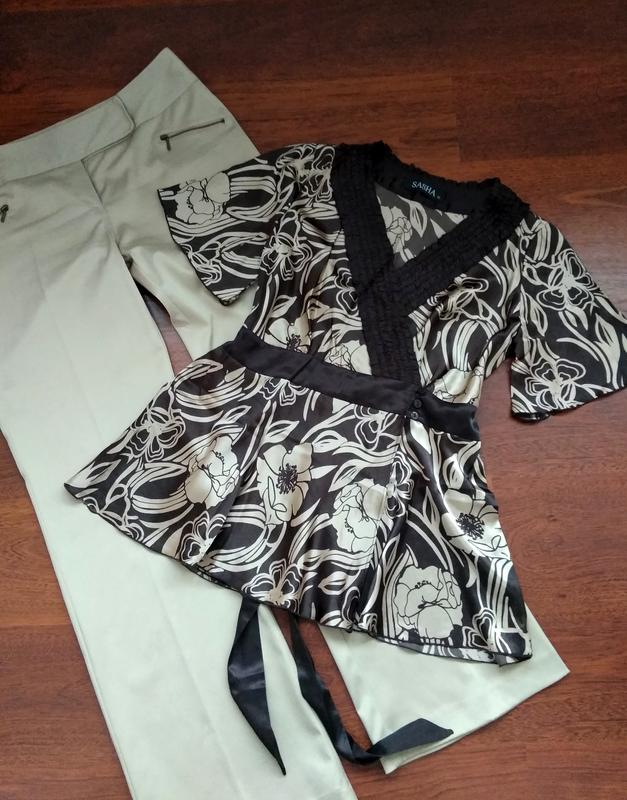 давно не носится, шелковистая пудра с шоколадом, одевалась с брюками (главное фото, очень нарядно), отличное состояние, интересный фасон на запАх с чуть завышенной талией, баcкой под пояс и расклёшенными рукавчиками длина 68см, от плеча до пояса 38см плечи 37см ширина между подмышками по спинке ок.45-46см (спереди запАх и вытачки на грудь от пояса) ширина по поясу в застёгнутом виде 42см, общий объём отрегулируется завязками сзади