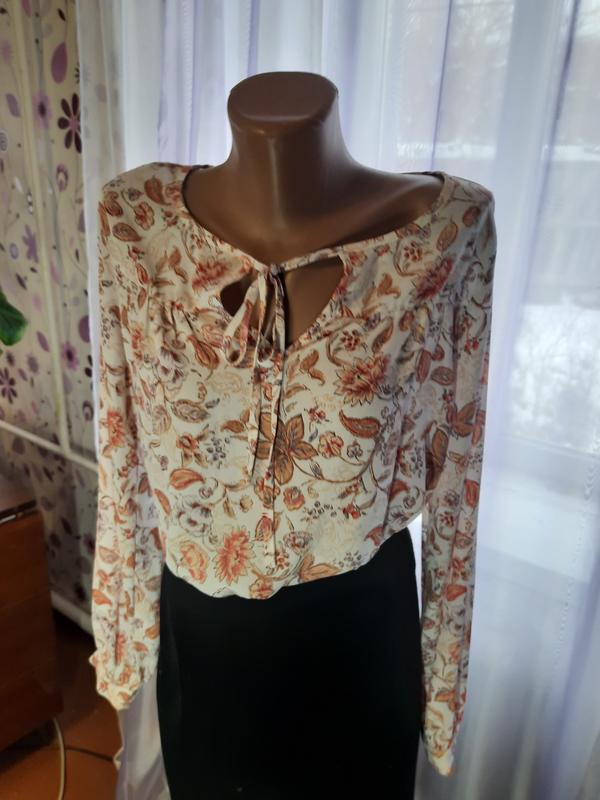 Елегантна блузка, тканина тонка, приємного принту, гарно спадає, не просвічується, шикарно виглядає в поєднанні зі спідницею. Довжина - 58 см, ширина спинки - 33,5 см, довжина рукава - 62см. Бірки відсутні.