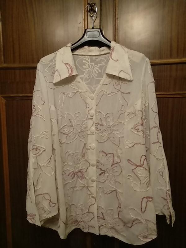 Блузка из белой жатой ткани с выпуклой вышивкой. Качественный индпошив. Воротник апаш. Рукава расширяются к низу, заканчиваются разрезом. Ткань с тонкой подкладкой-вуалькой. Блузка очень элегантно смотрится, можно использовать как нарядную и повседневную. Поб 65 Пот 62 Поб 70 Длина 84 Длина рукава63 Бицепс 24