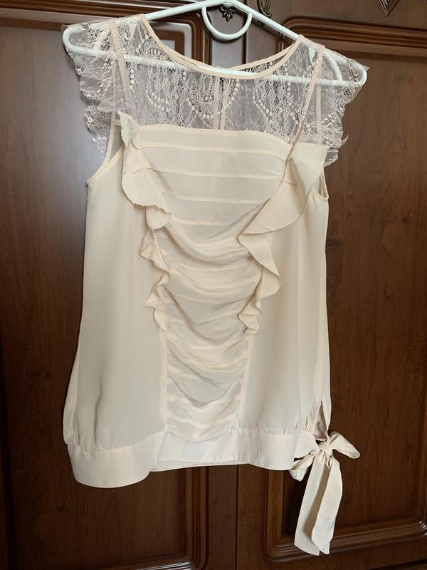 Красивая блузка персикового цвета.Размер М можно и на S ПОГ: 43 см. Плечи без воланов:30 см. Длина:60 см. Низ на выходе:48 см. Доставка:нп