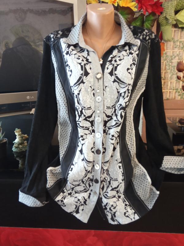 Очень красивая, стильная и дизайнерская блуза с орнаментом, в сочетании разных тканей. Пуговицы винтажные, материал тянется и приятный к телу, замеры спрашивайте отвечу в переписке.