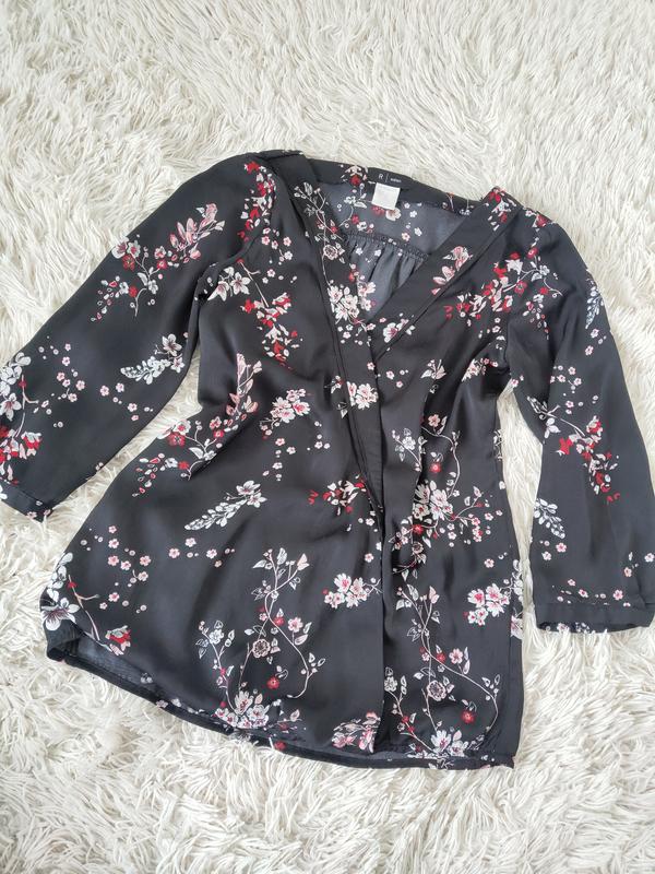 Блуза в квіти з V вирізом, легкою тканиною, рукавом 3/4. Виробник Франція. Нюанс затерте покриття ґудзиків(останнє фото).